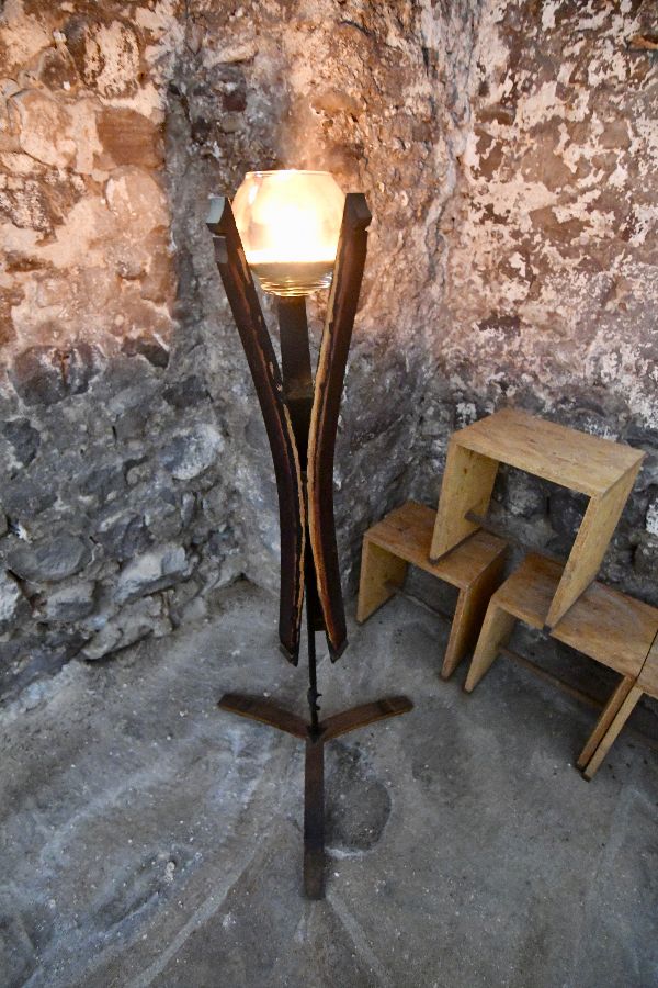 Warm, soft light. Wood matured and dyed by nature. This tripod stand made of barrique barrel staves is offered with and without glass ball. For interiors and terraces.